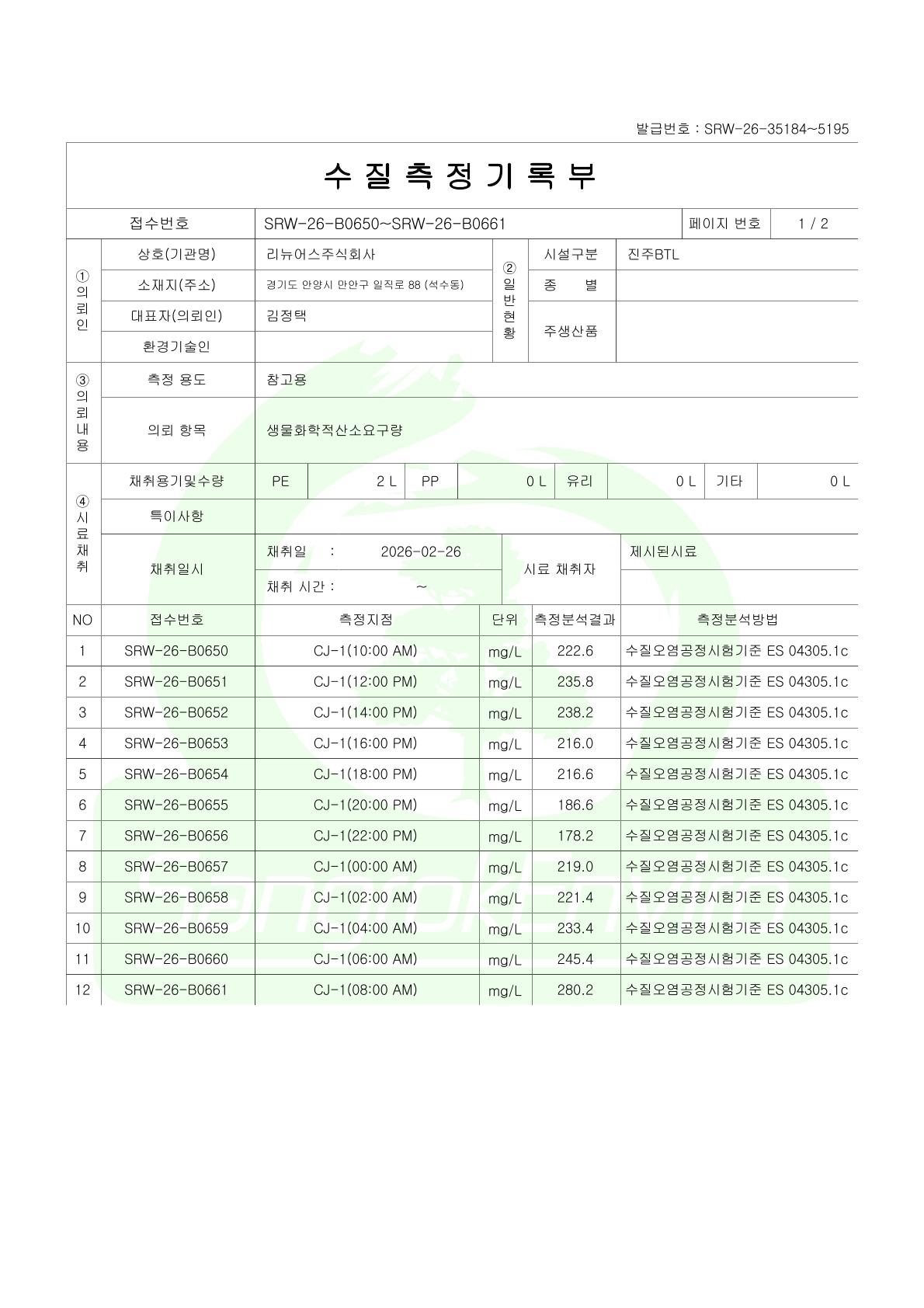 BTL 2단계 2026년 02월 수질분석 시험성적서
